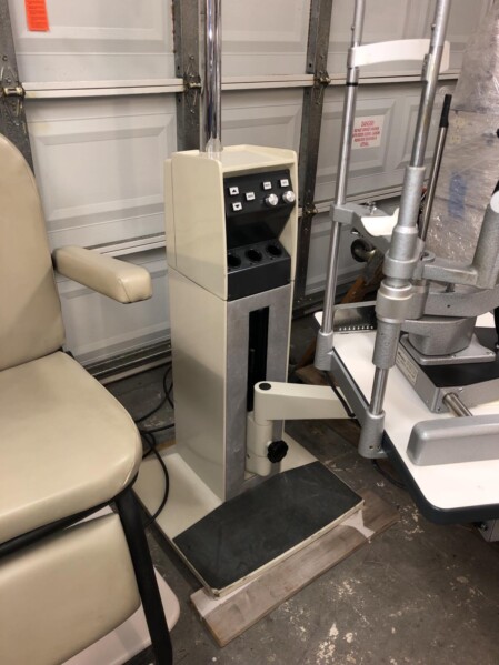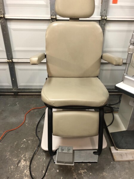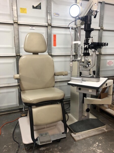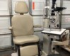 Reliance 5200 exam chair with a Reliance 7700IC stand. The chair has a manual recline and power hydraulic up/down. It can lift up to 500 lbs. The stand has a console with three rechargeable wells and hand release lock on slit lamp arm. The chair is in good condition. The stand is in good condition but has a few scratches on the base.