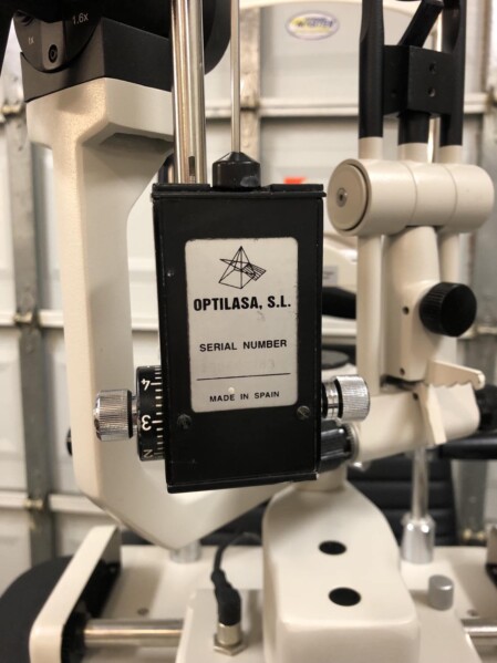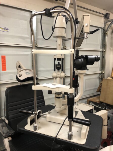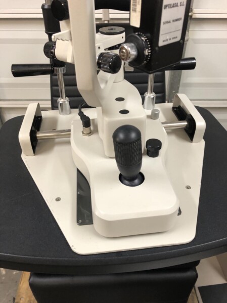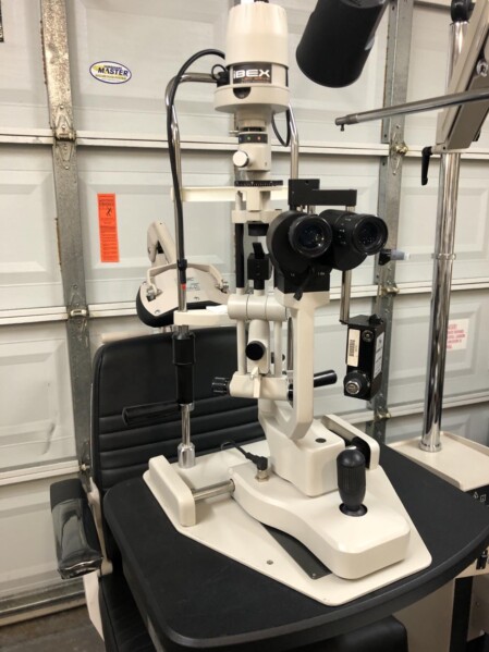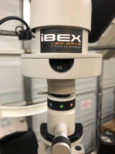IBEX 2 step LED slit lamp in excellent condition with applanation tonometer available from Treasure Coast Ophthalmic. Never change a bulb again. This is a Haag Streit style slit lamp with converging optics.